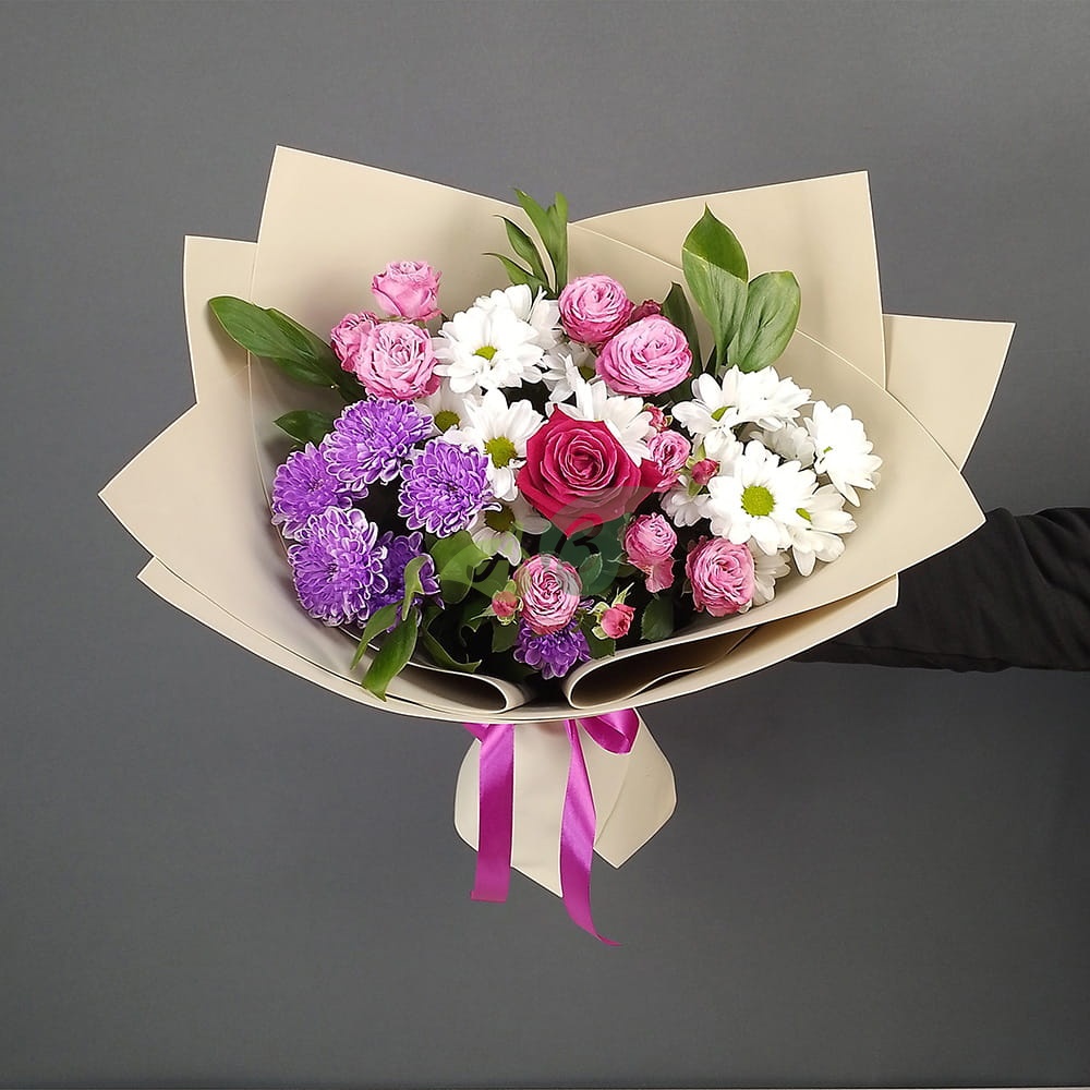 Сборный букет из кустовых роз и хризантем – это недорого и красиво. Такие цветы можно покупать для разных праздников и вовсе без повода.